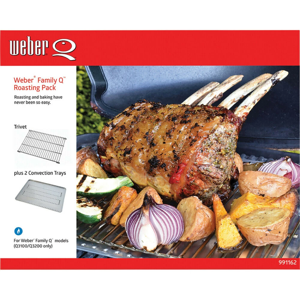 Enjoy juicier, more succulent roasts. The Weber Family Q roasting pack consists of a Weber trivet and 2 convection trays that create natural convection, allowing super heated air to circulate all around the meat.
